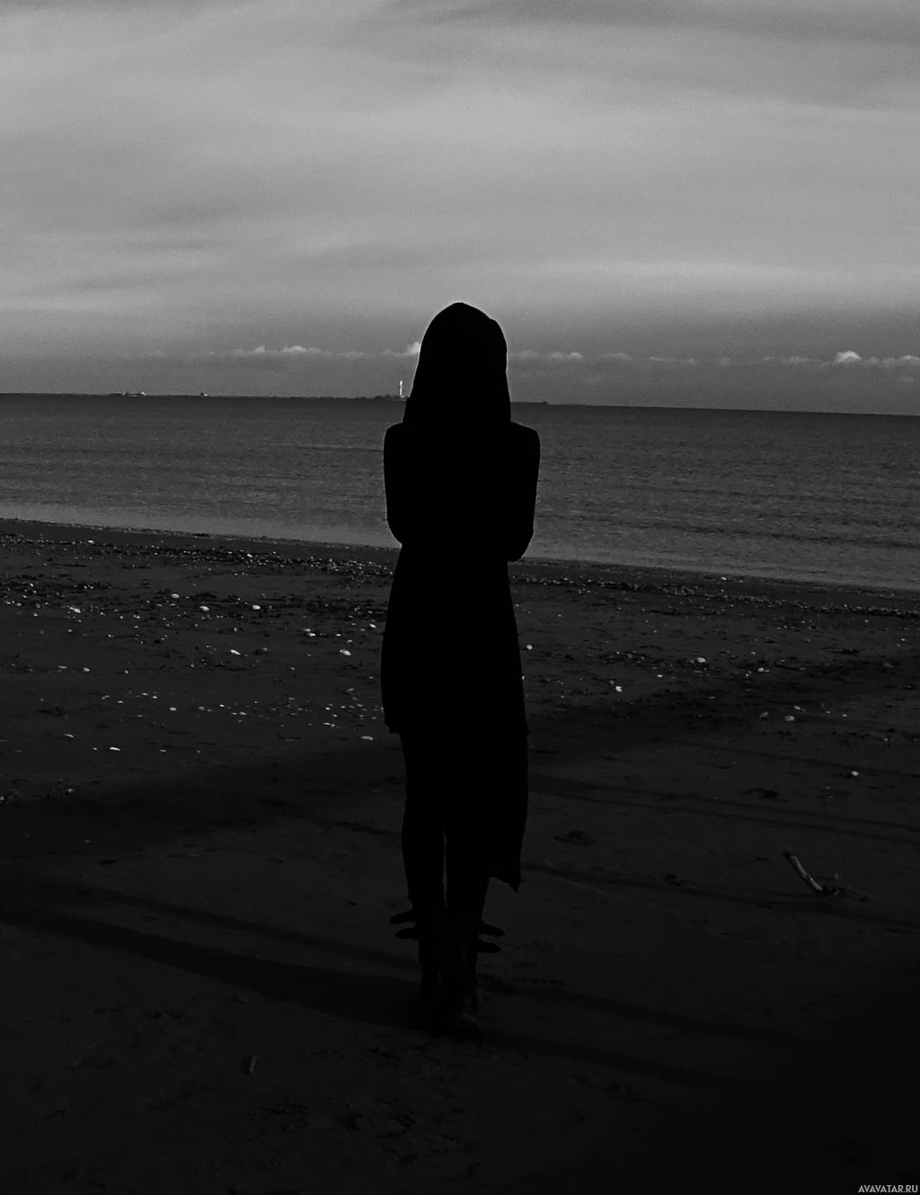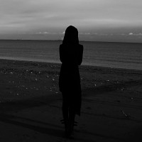 dark clothing and facing the ocean, with her back to the camera. Her posture suggests she might be looking out at the horizon or simply enjoying the view. The colors in the image are quite muted, with
