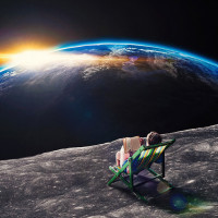 casual clothing suitable for lounging outdoors. In the background, there is a depiction of Earth viewed from space, showing