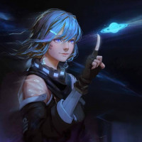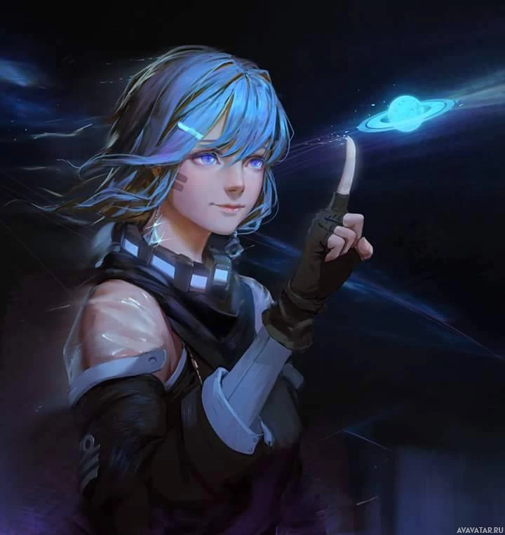 a confident expression on her face and is pointing upwards, which could suggest she's directing attention or discussing something related to the stars or universe. The character is depicted with an armband that includes some