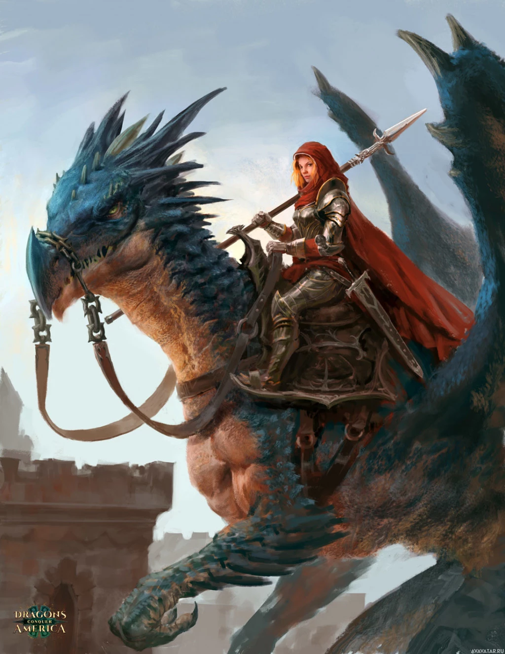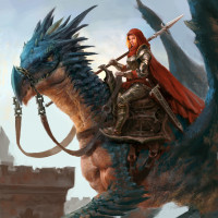 a female character riding on the back of a blue dragon. The character is wearing armor and has long, flowing