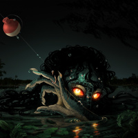 pale skin and features that suggest an eerie or ghostly appearance. In its mouth, the mermaid holds a red balloon with a white dot, which contrasts vividly against its otherwise