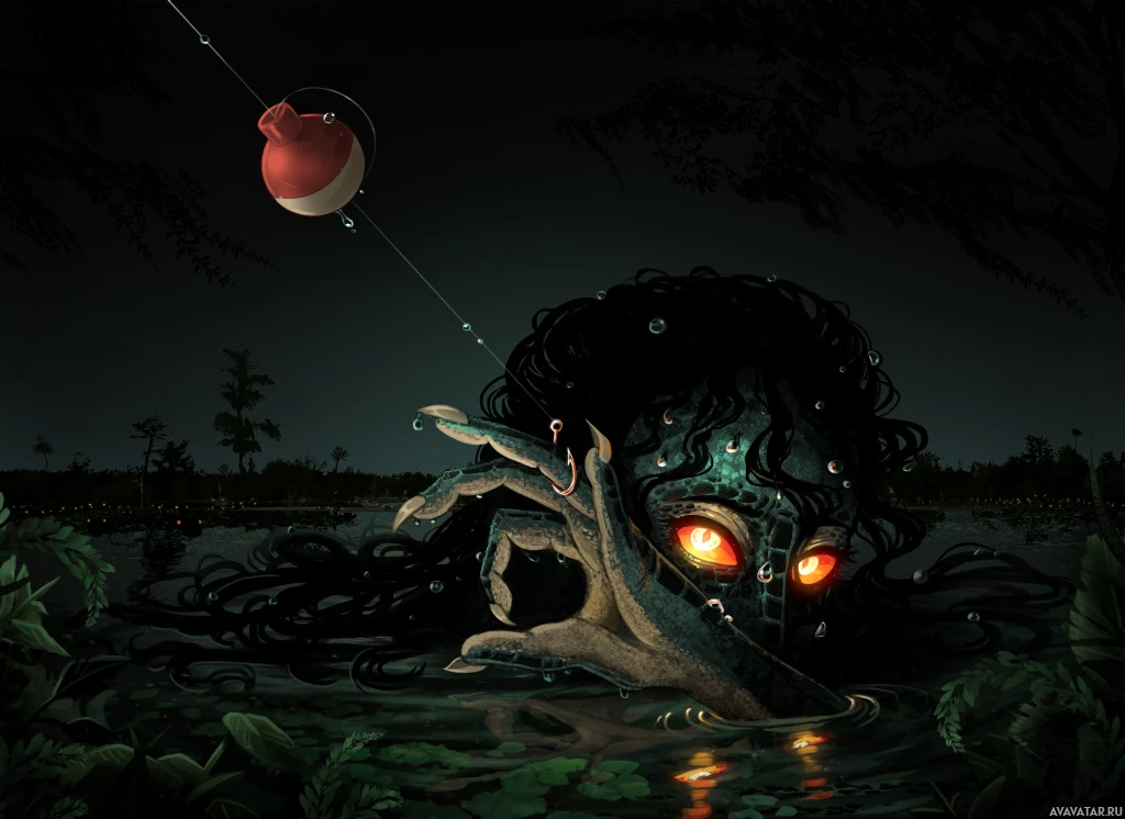 the otherworldly atmosphere of the scene. There are trees and vegetation around, indicating that the location could be near a body of water, possibly a swamp or pond, as suggested by the stillness of the water's surface and the reflections of light on its surface. The overall mood conveyed by the image is one of mystery and supernatural eeriness.