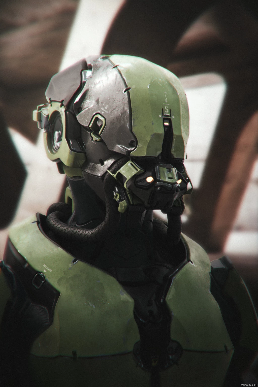 a metallic head and torso, with mechanical details visible on its surface. The background is blurred but appears to be a setting that could be related to this robot's story or environment. This type of character is often found in science fiction media where
