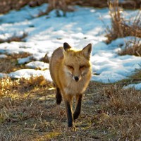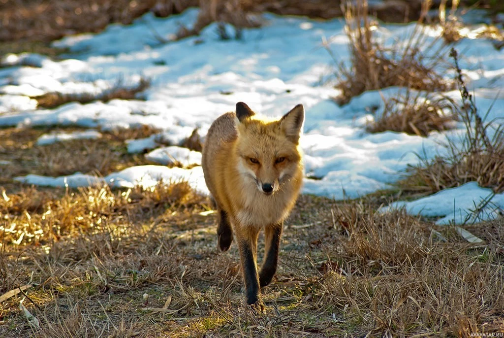 The image features a fox walking across what appears to be a snow-