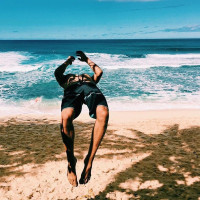 The image shows a man in mid-air over the beach, with his arms extended outwards as if he's either jumping or falling into