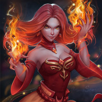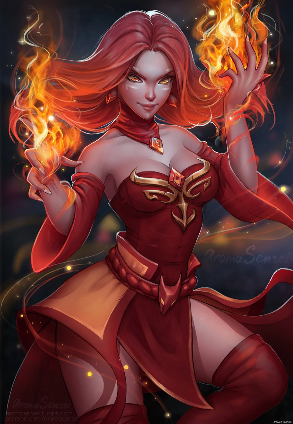 red hair and glowing flames emanating from her hands. She is wearing