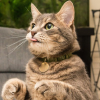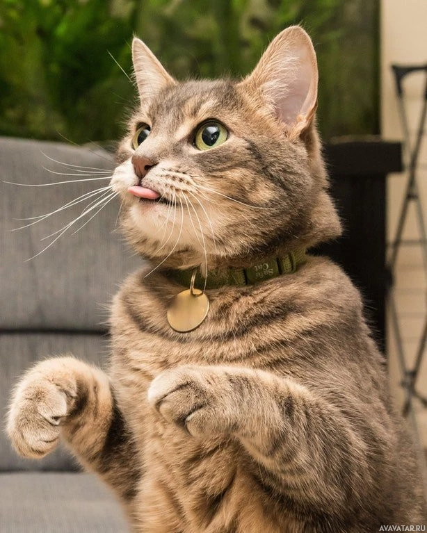 На картинке изображена кошка, стоящая на задних лапах с поднятой лапой, как будто она умоляет или тянется за чем-то. Кошка имеет полосатое пальто и, кажется, находится в помещении в комнате с мебелью, видимой на заднем плане.