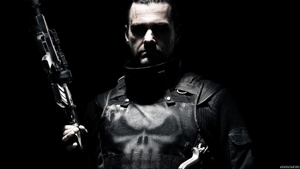 Это изображение персонажа, известного как Каратель. Он изображен с серьезным выражением лица, держа в правой руке то, что кажется пистолетом. Каратель — вымышленный персонаж из Marvel Comics, который становится мстителем после потери своей семьи и подвергается эмблеме черепа на груди.