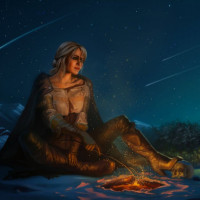 The image depicts a character named Ciri from the video game "The Witcher 3: Wild Hunt." She is sitting by a campfire, with a backdrop of snow-covered mountains and stars in the night sky. The scene conveys a sense of solitude or contemplation.
