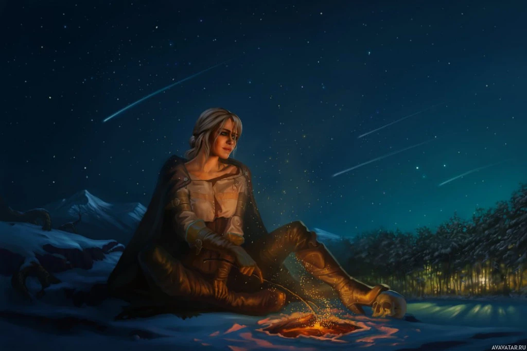 На картинке изображен персонаж по имени Чири из видеоигры «Ведьмак 3: Дикая Охота». Она сидит у костра, на фоне заснеженных гор и звезд в ночном небе. Сцена передает чувство одиночества или созерцания.