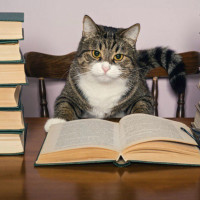 an attentive expression, as if it's reading or studying from one of the open books that are in front of it. The setting suggests a humorous scenario where the cat is 'studying,' which is a whimsical and anthropomorphic portrayal since cats typically do not engage in such