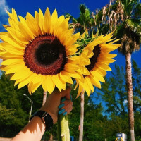 In the picture, there are two bright yellow sunflowers being held by a person. The sunflowers have brown centers and are arranged in a bouquet-like fashion. They are placed against a clear blue sky with palm trees visible in the background.