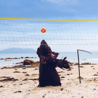 a clear sky, rocks in the water, and a net typical for beach volleyball. The overall scene is whimsical and out of place given the context of Death playing with sports