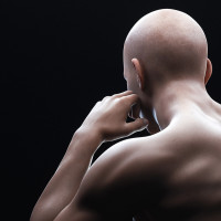 The image shows a side view of a person's back. The individual appears to be seated with their hands clasped together, possibly in a contemplative pose. They have a bald head and the skin tone suggests they might be of Asian descent. This is an artistic rendering or digital illustration rather than a photograph of a real person.