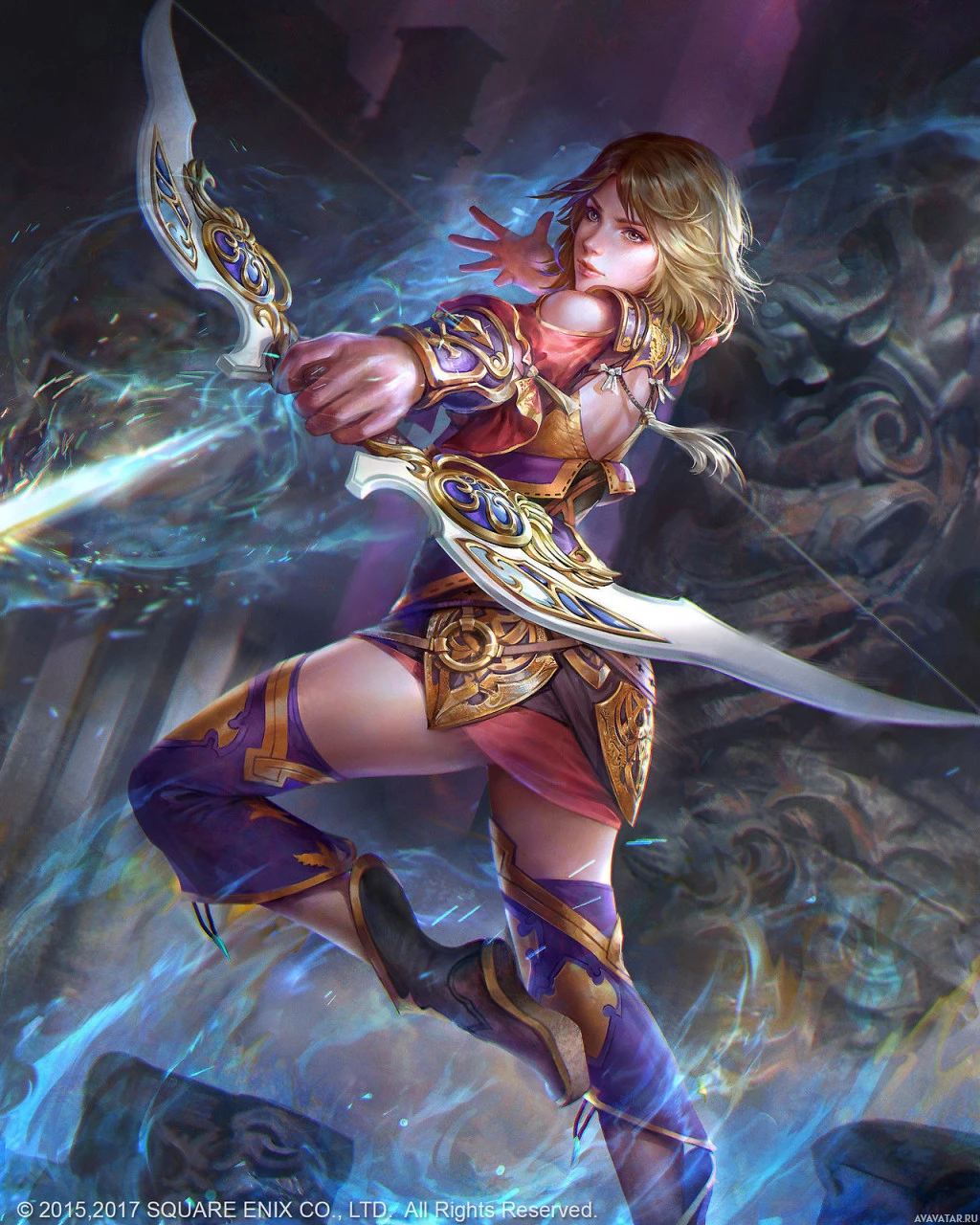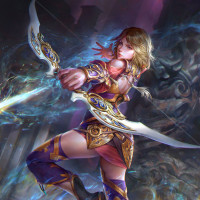 blonde hair, is holding a bow in one hand and arrows in the other, suggesting she might be a warrior or archer from a fantasy setting. Her outfit includes armor pieces that look ornate and magical in nature, with glowing effects around her indicating she may have