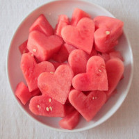 На картинке изображена чаша, содержащая кусочки арбуза в форме сердца. По-видимому, он установлен на белой поверхности, возможно, на скатерти. Других значимых объектов или людей на картине нет, она фокусируется исключительно на творчески вырезанных плодах.