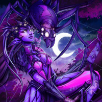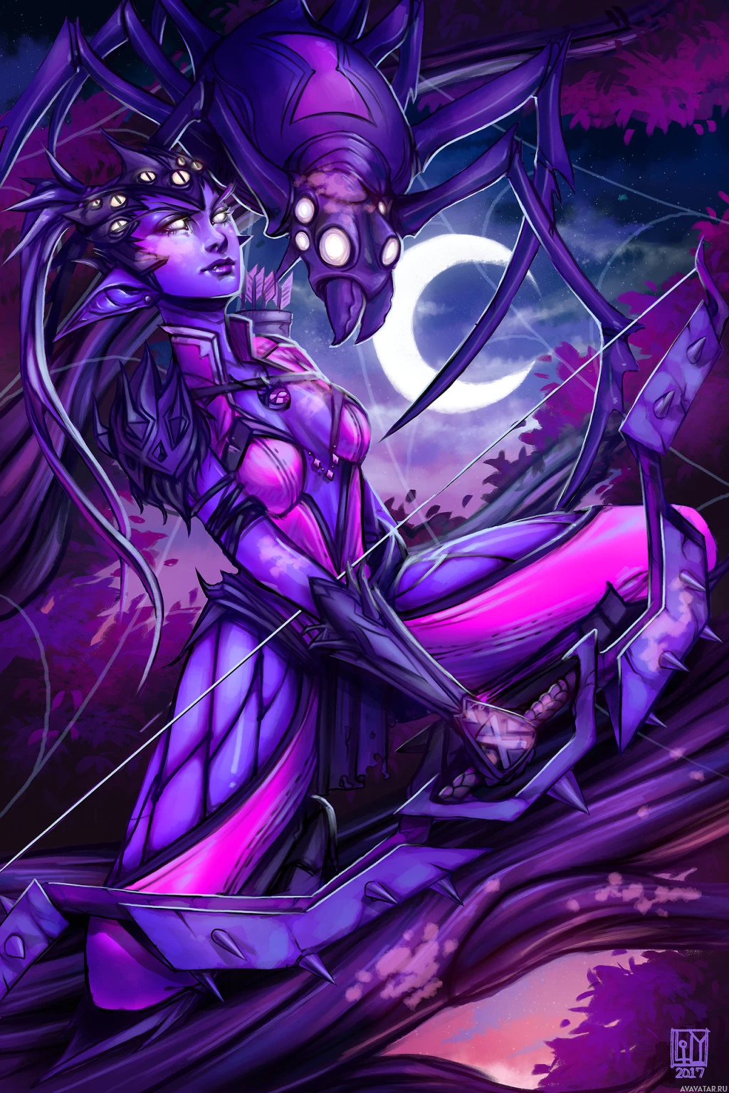 purple armor and she has a spider emblem on her shoulder. The scene is quite detailed and conveys a sense of fantasy or science fiction commonly found in Overwatch's lore.