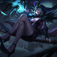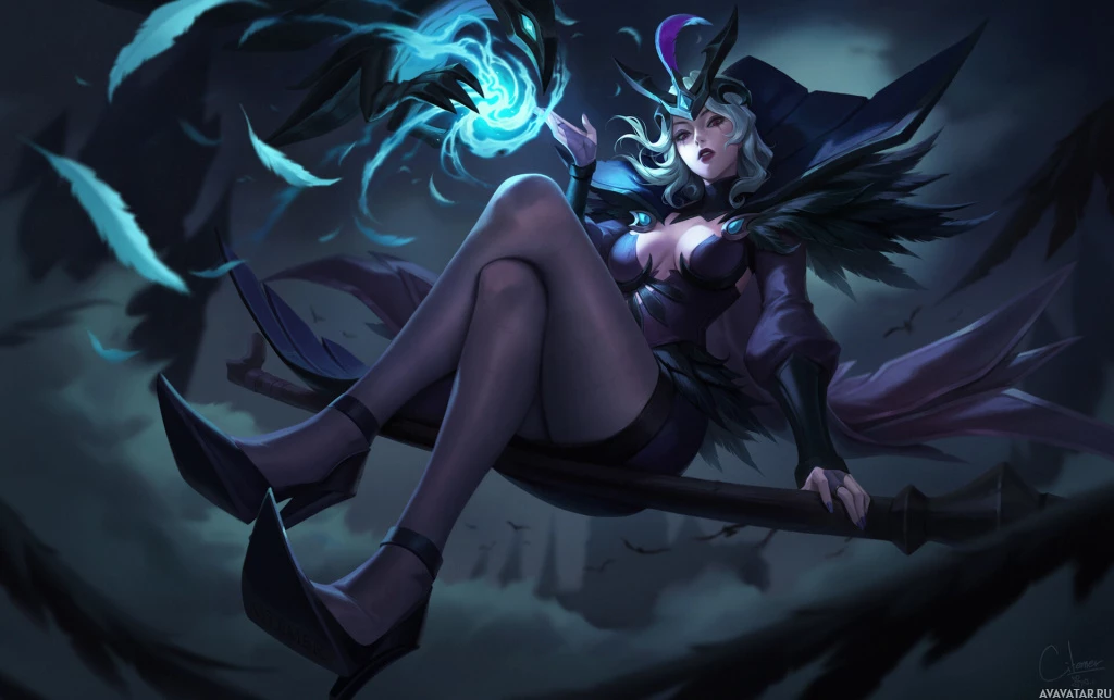 video game "League of Legends." The character is depicted in a fantasy setting with a dark and moody atmosphere, which is consistent with the overall theme of the game. The character is holding what appears to be a magical staff or wand, suggesting that she may have some kind of
