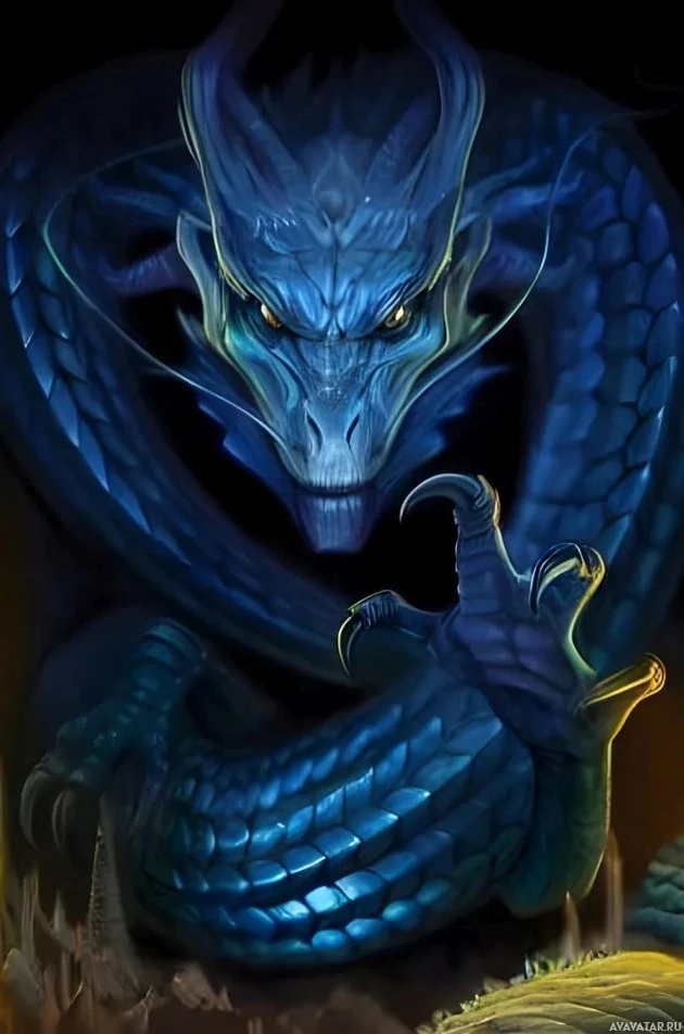 a dynamic pose, with its wings spread wide and mouth open as if roaring or breathing fire. Its scales appear to be blue, giving it a menacing and majestic appearance. In the background, there are hints of other creatures that might be part of
