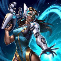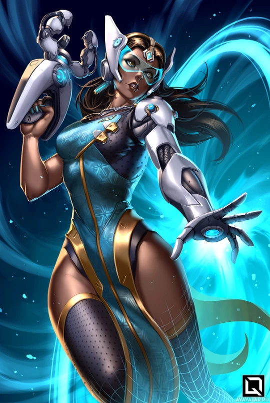 an animated character from the game "Overwatch." This character is known as Symmetra, who is