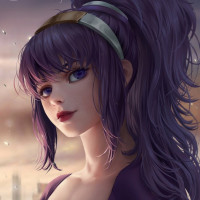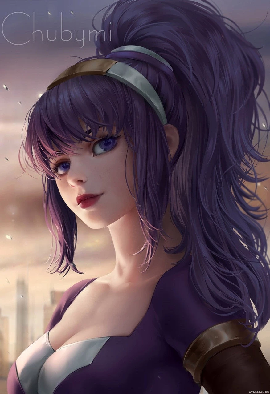 a female character with purple hair. She has a stylized appearance, which is common in graphic art and anime-inspired designs. Her outfit seems to have some fantasy elements, such as the band on her head that could be part of a headdress or headwear associated with