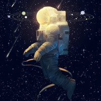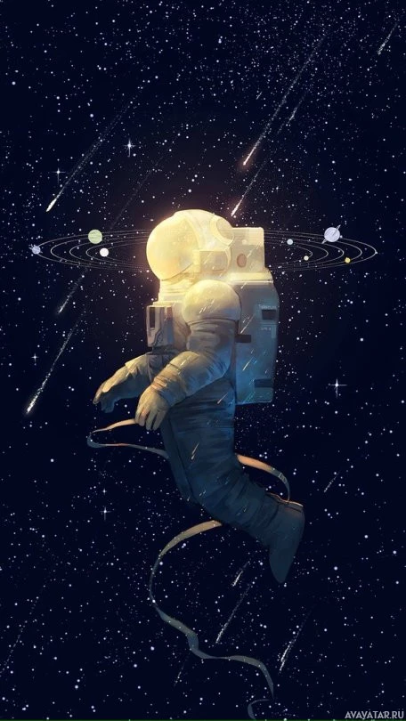 an astronaut in space. The astronaut is wearing a spacesuit and appears to be floating or drifting away from a spacecraft, as indicated by the tether. In the background, you can see stars, comets, asteroids, and other
