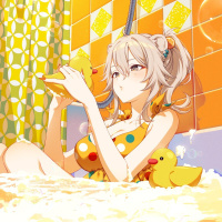 an animated character, a girl with gray hair and what appears to be cat-like ears or a similar feature. She is wearing a colorful bikini that resembles