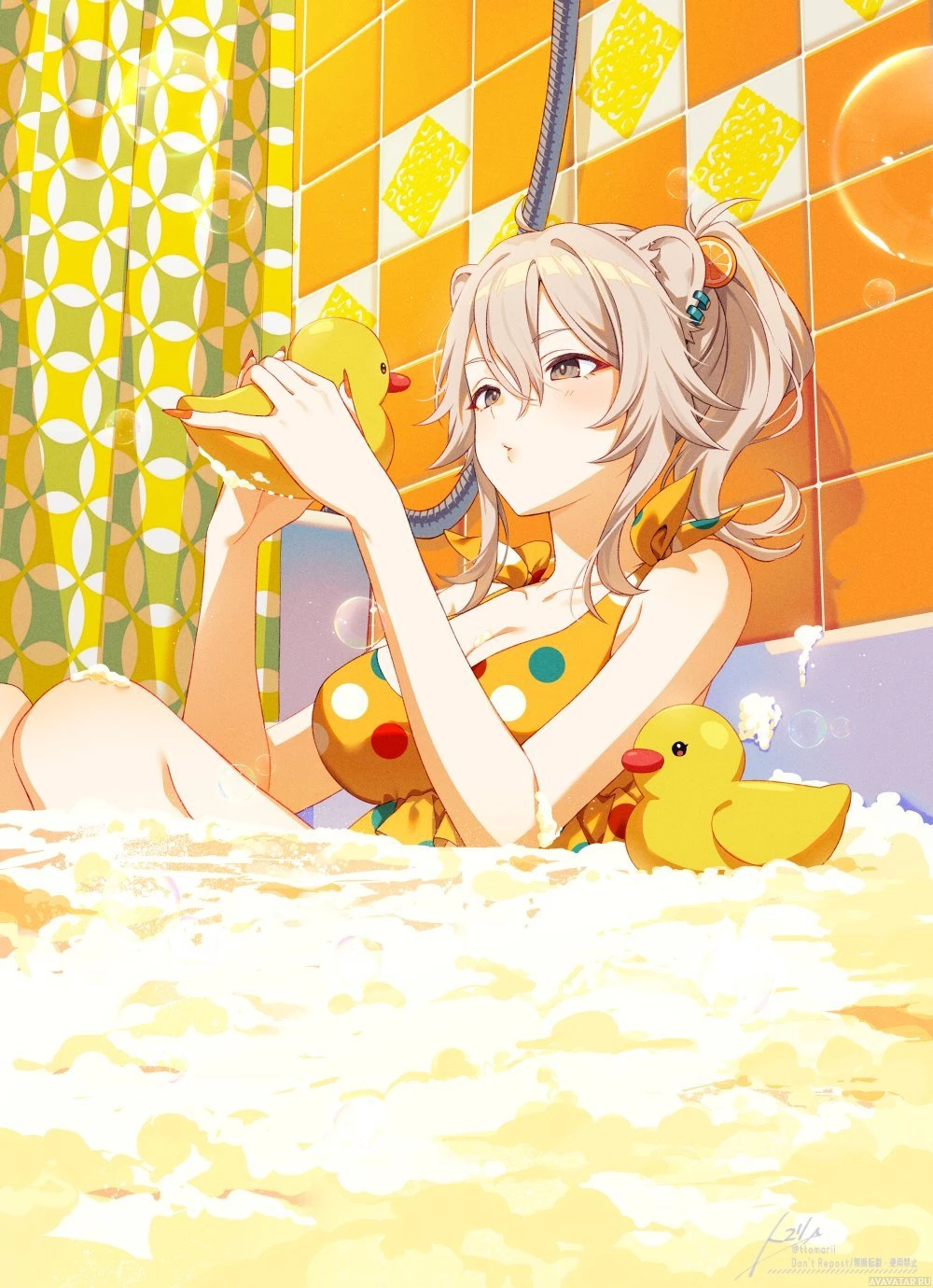 soap bubbles or another type of bathing product. There's a sense of whimsy and fantasy to the scene, as the character seems relaxed and is enjoying herself despite