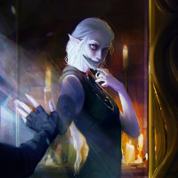 a fantasy scene featuring a character with white hair, dressed in what appears to be an ornate outfit, possibly resembling attire of the Drow race. The character is standing behind a mirror or reflective surface, looking at their own reflection, and there's another figure visible on the left side of the frame, suggesting interaction or companionship with