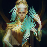 pointed ears and is adorned with intricate jewelry, including what looks like feathers or leaves around her neck. Her hair is styled in an updo that could suggest she is of royal lineage or possesses some form of