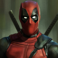 a slight smirk, suggesting a sarcastic or irreverent tone typical of the character. He wears his signature red and black costume, which consists of an unbuttoned red shirt with