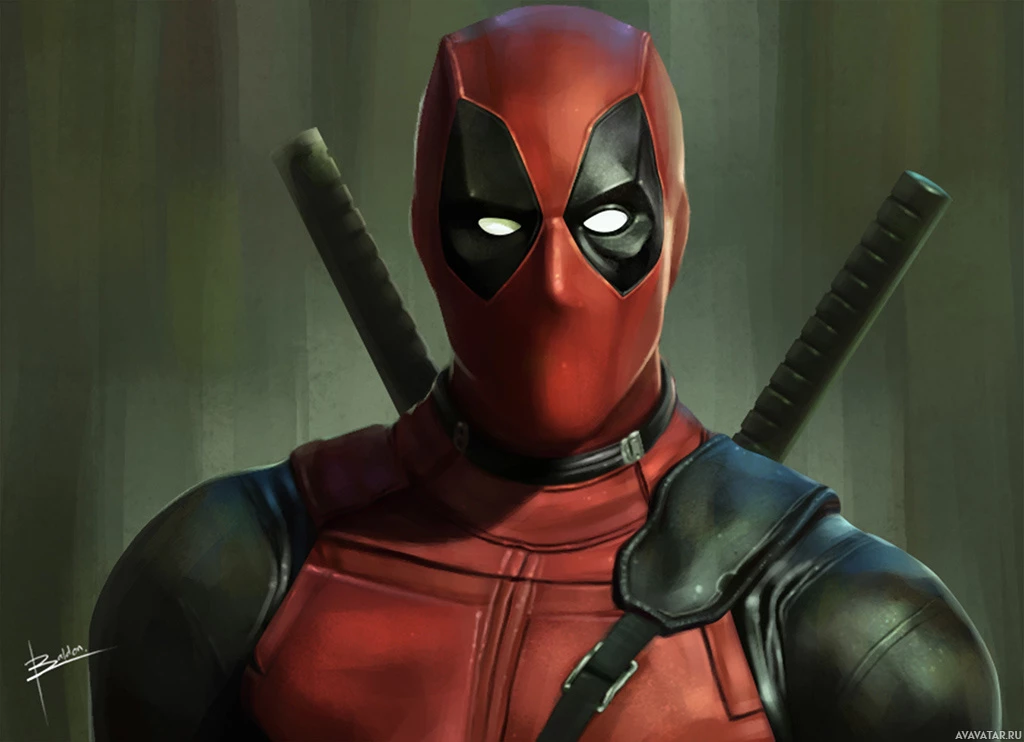 black pants, and he has two katanas crossed behind him. The artwork is realistic and detailed, capturing the essence of Deadpool's persona as a mercenary and anti-hero with a dark