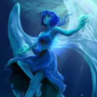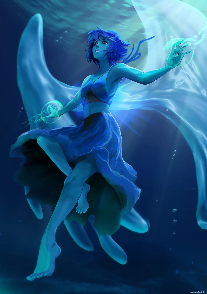blue hair and blue eyes, wearing a dress that has a fantastical appearance. She is sitting on the back of what seems to be a whale or