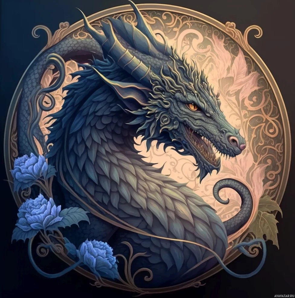 shades of blue and green. The dragon's tail curls elegantly around the body, adding to the mythical appearance. The background is a dark,