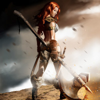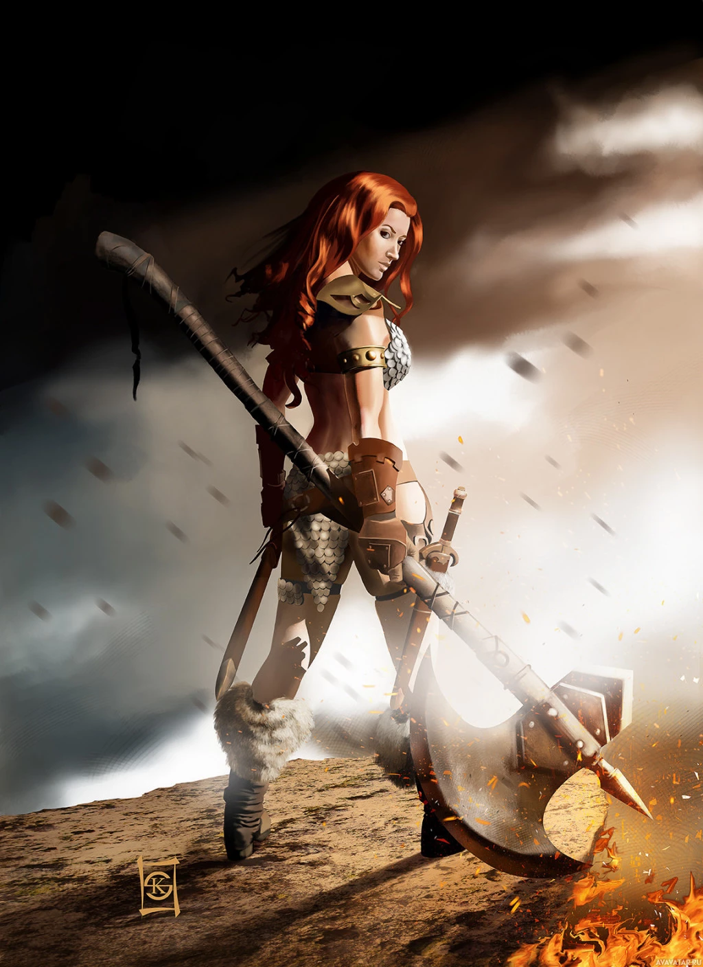 red hair and is holding an axe in one hand, suggesting that she may be a character from a fantasy setting. She's standing with her back towards the viewer, looking into the distance, which gives