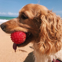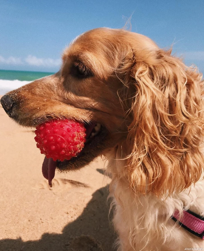 a sandy beach, holding a red ball in its mouth. It appears to be enjoying itself at the beach, possibly after playing fetch or fetching this ball. The setting is during daylight with