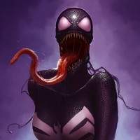 The image shows a character wearing the iconic black and white Spider-Man costume, which is associated with the Marvel
