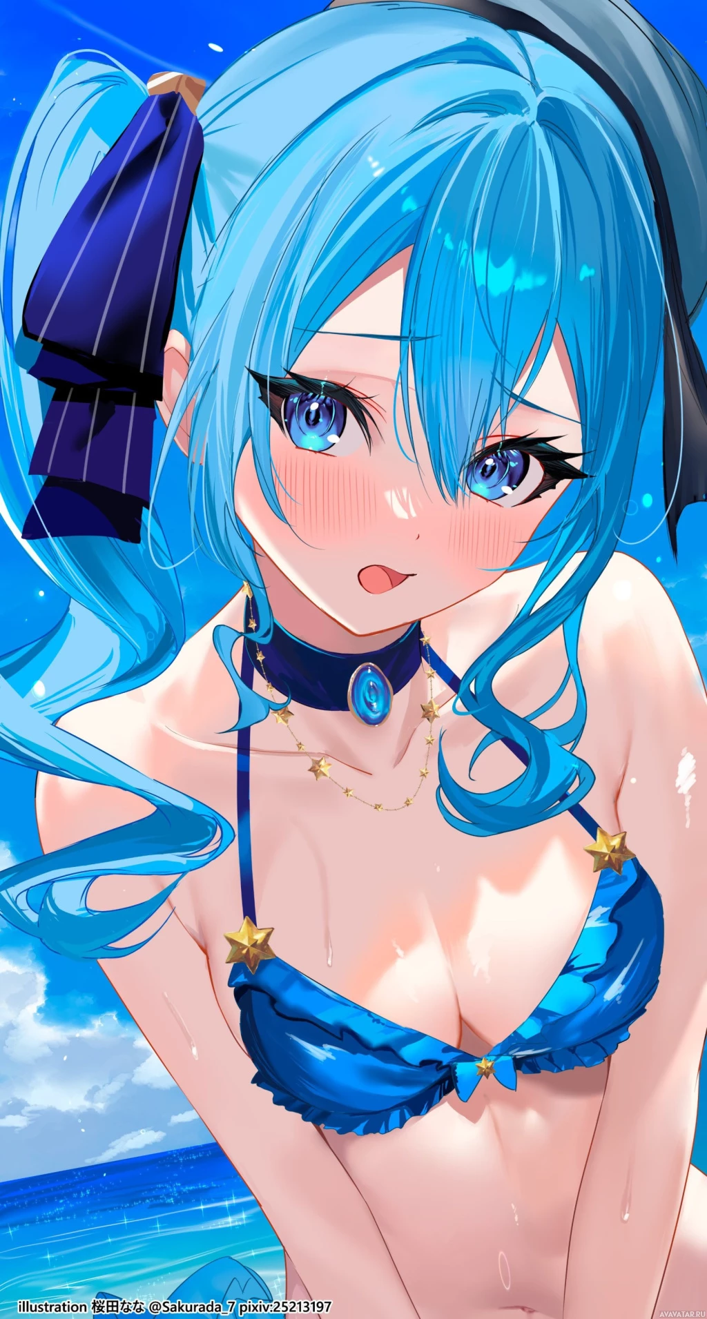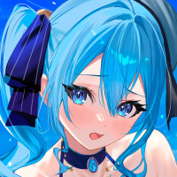 На картинке изображен анимированный персонаж с синими волосами, одетый в синий купальник и держащий голову одной рукой. Она расположена на фоне тропического пляжа под ясным голубым небом.