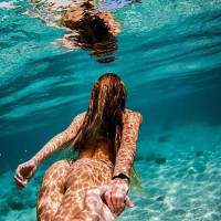 a person in the water, likely swimming or snorkeling. The person appears to be from behind and is wearing