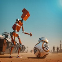 robot character standing upright with its arms raised. To the right of this robot is a droid resembling BB-8 from the "