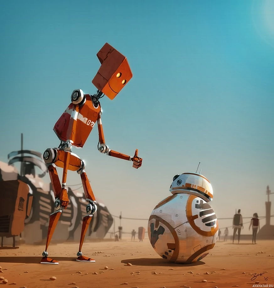 Star Wars" franchise, which is also standing upright but with its dome head turned towards the other robot. Both robots are on what appears to be a desert or