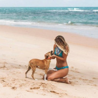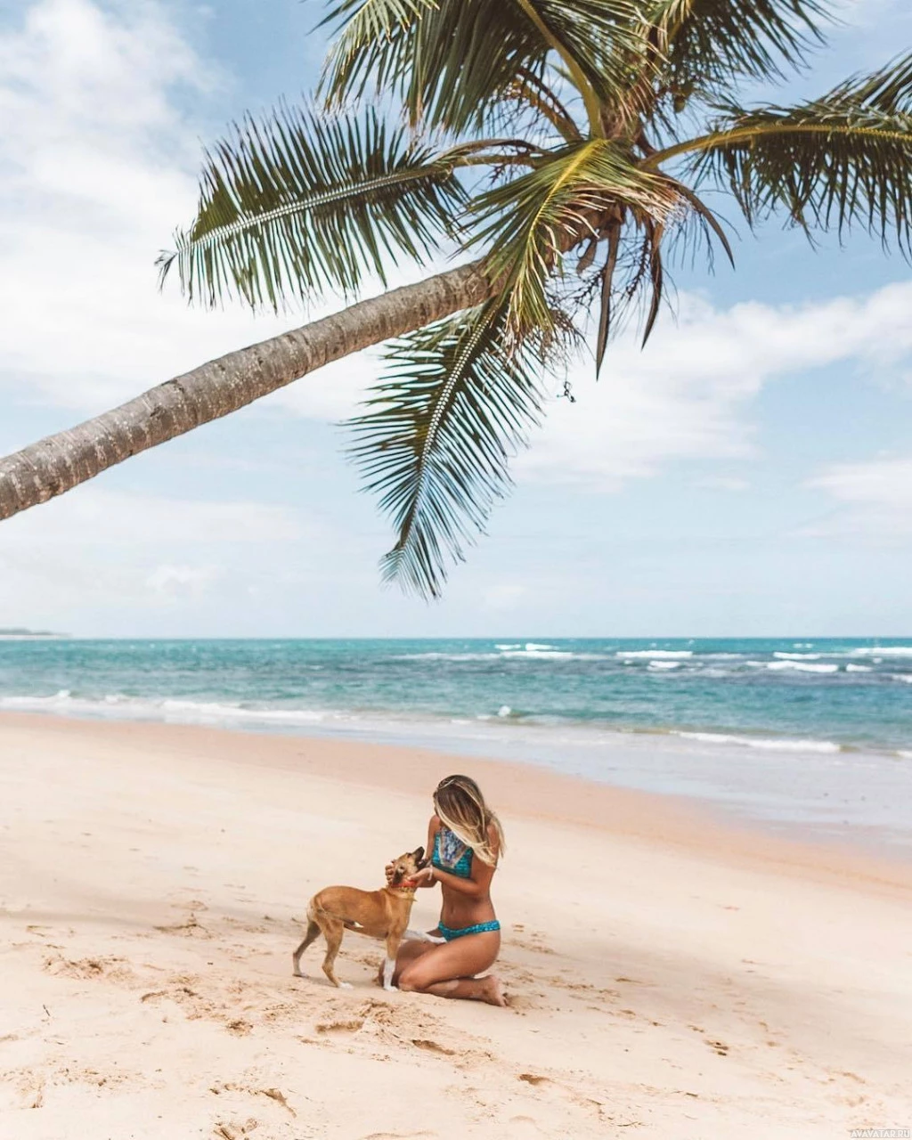 На картине изображена девушка, которая, кажется, стоит на коленях на песчаном пляже. У нее есть собака, и они оба, кажется, наслаждаются солнечной погодой. Пальмы видны на заднем плане, что указывает на тропическое расположение. Небо ясное и голубое, что указывает на хорошие погодные условия.