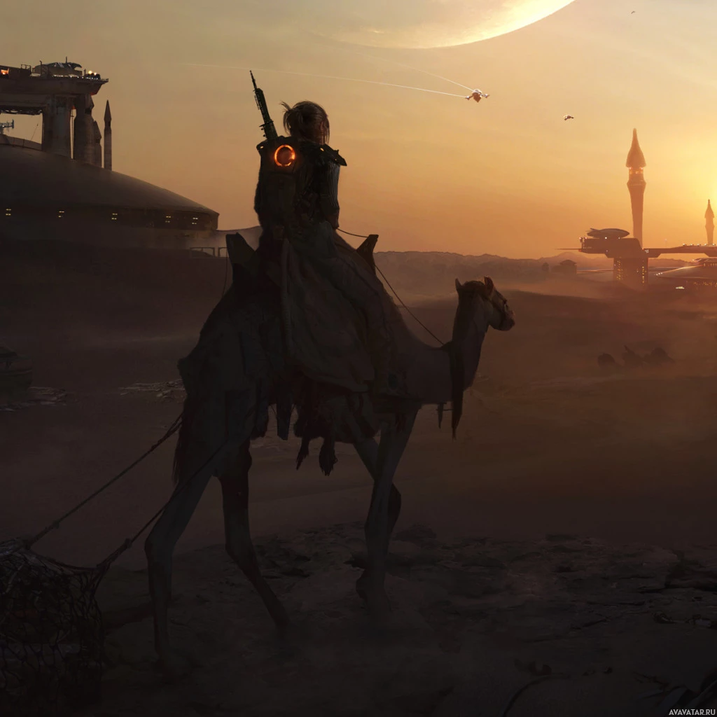 a science fiction scene set in what appears to be a desert environment. In the foreground, there is an individual riding a camel with