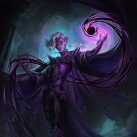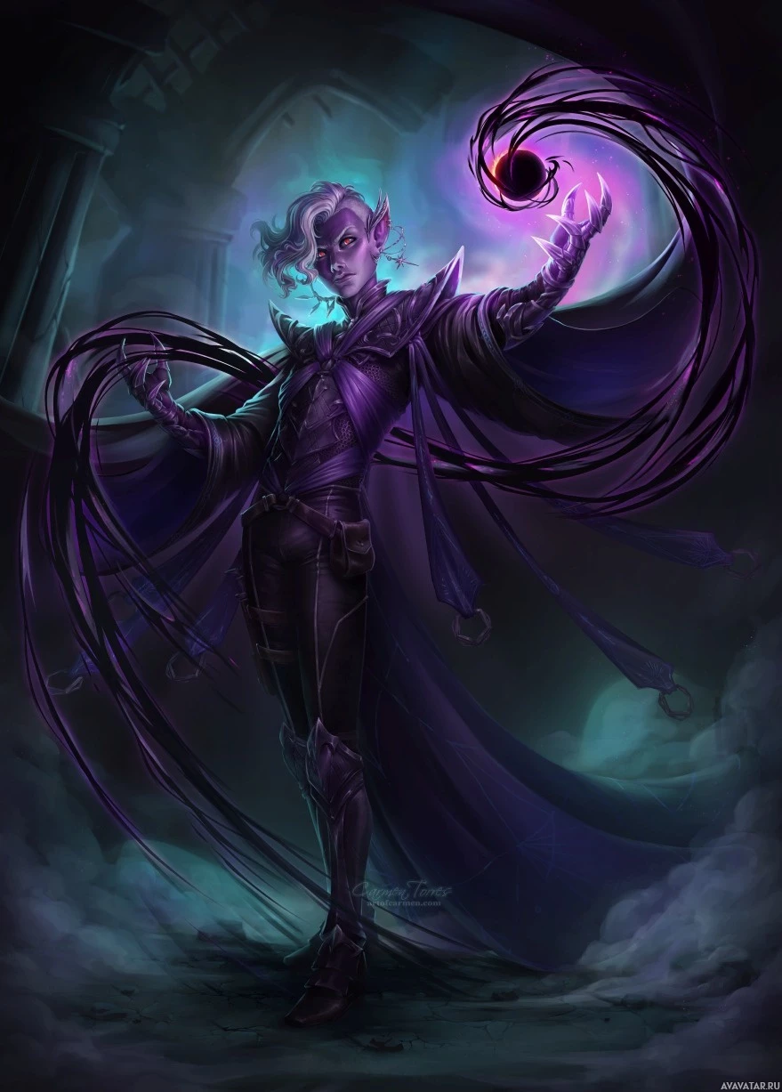 a fantasy character who appears to be of drow heritage. This creature is shown with elongated ears that suggest an elven or drow influence, and has purple skin, which is characteristic of
