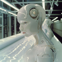 a research facility dedicated to robotics. The overall image has a science fiction vibe, with the presence of the robot evoking themes commonly associated with the genre such as artificial intelligence and the future of technology. The style of the picture suggests it could have been taken from a scene in a movie or a conceptual photo shoot related to technology advancement.
