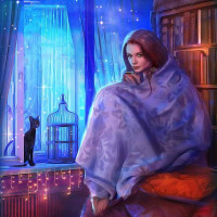 magical atmosphere with soft blue lighting, possibly suggesting it is either twilight or night. The girl's expression and the overall setting evoke a sense of calmness and