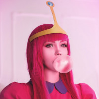 In the image, there is a character dressed in costume that resembles Princess Bubblegum from the animated television series "