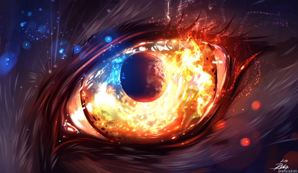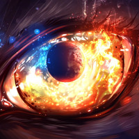 The image features a close-up of an eye with a fiery or explosive background, often associated with the word "fire." The artwork is highly detailed and has elements that could be interpreted as sparks or embers. It gives off