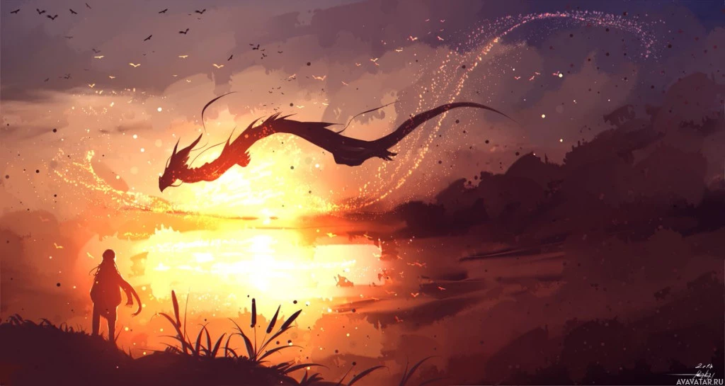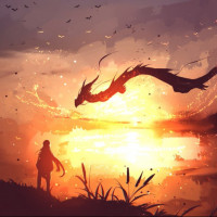 majestic dragon flying across the sky at sunset or sunrise, with a warm glow illuminating the scene from behind and below. The