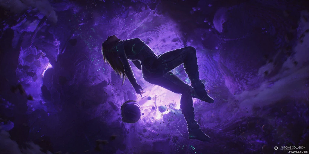 The image depicts a character who appears to be lying on their side, with one arm stretched out. They are surrounded by a purple and blue nebula-like pattern that gives off the appearance of cosmic elements or possibly